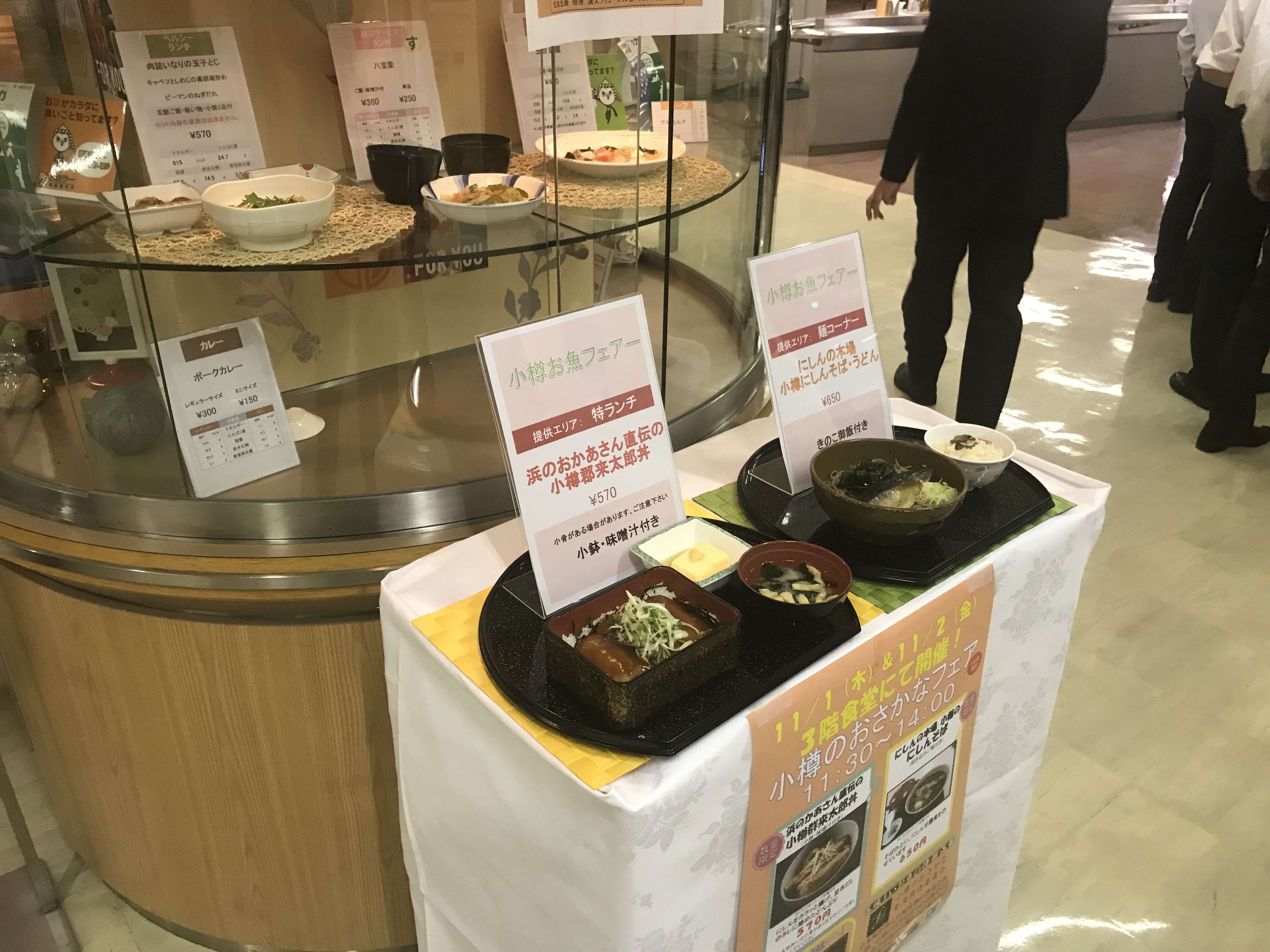 HOME » TOPICS » 小樽のおさかなフェアを開催します 小樽のおさかなフェアを開催します 2019.10.11 小樽のおさかな普及推進委員会では、小樽産の水産物を普及するため、昨年より首都圏大手企業様の社員食堂でメニュー提供を行っています。 今年度第2回目はみずほ銀行大手町本部様で、10月21日~25日に「群来太郎丼」外3品が日替わりで提供される予定です。首都圏の皆さんに少しでも小樽のおさかなの美味しさを伝えられればと思っています。 今回の提供メニュー ①群来太郎丼 ②鮭の焼き魚 ③にしんそば ④ほっけのフライ ※今回は残念ながら一般の方は入場できません。 ※写真は昨年の住友生命様で撮影したものです。