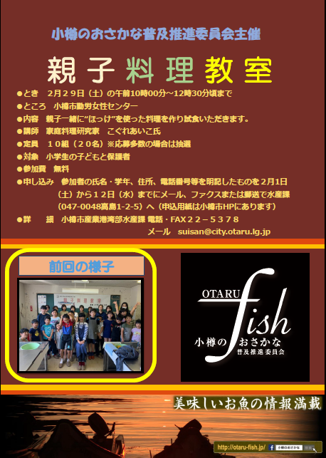 令和2年2月29日(土)、小樽のおさかな普及推進委員会主催の第2回親子料理教室「ほっけの三枚おろしをマスター!」を開催します。